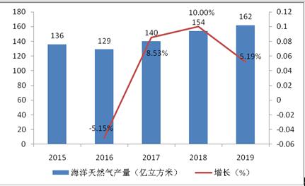2018中国海洋天然气产量达到154亿立方米,环比增长10.00%,2019年中国海洋天然气产量持续增长,达到162亿立方米,环比增长5.4%。