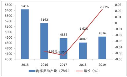 2019年中国海洋油气业发展态势良好,其中海洋原油生产增速由负转正,扭转了2016年以来产量连续下滑的态势,实现产量4916万吨,环比增长2.27%。