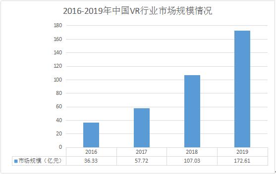 2019年,国内VR行业市场规模约为172.61亿元,较2018年上涨了61.3%。从近几年的走势来看,VR行业发展迅速,未来市场空间较广。
