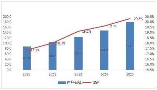 图表:2021-2025年智能军事行业市场规模及增速预测(亿元)