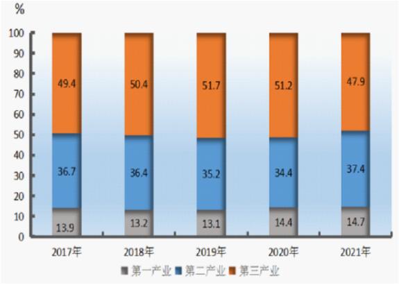 图表:2017-2021年三次产业增加值占地区生产总值比重