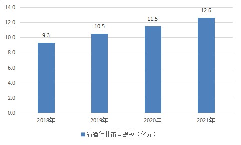 随着人们收入水平不断提高以及健康意识的增强,对于酒的消费从低层次的酒精过瘾转向饮用具有一定营养价值的酒品,清酒逐渐受到当代年轻人的青睐。据报告显示,近几年中国清酒行业市场规模持续增长,2021年中国清酒行业市场规模达到12.6亿元,中国清酒行业市场规模持续增