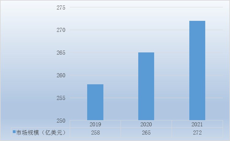 2019-2021年,全球硅酸钙市场规模呈现逐年增长的态势。2019年,全球硅酸钙行业市场规模为258亿美元,2021年全球硅酸钙行业市场规模达到272亿元。