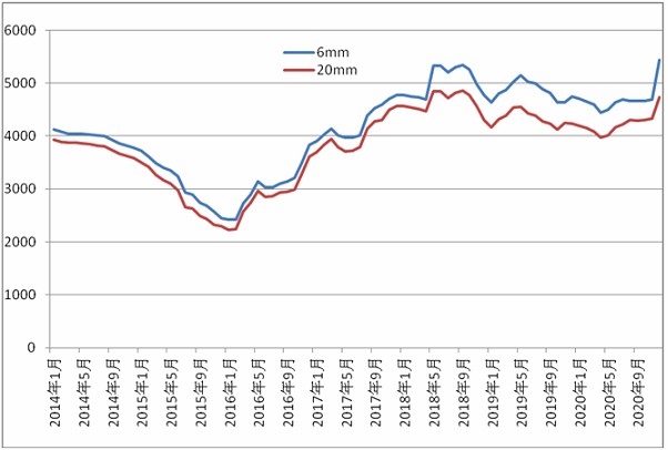 图表:2014~2020年国内6mm和20mm船卷板月均价格走势图