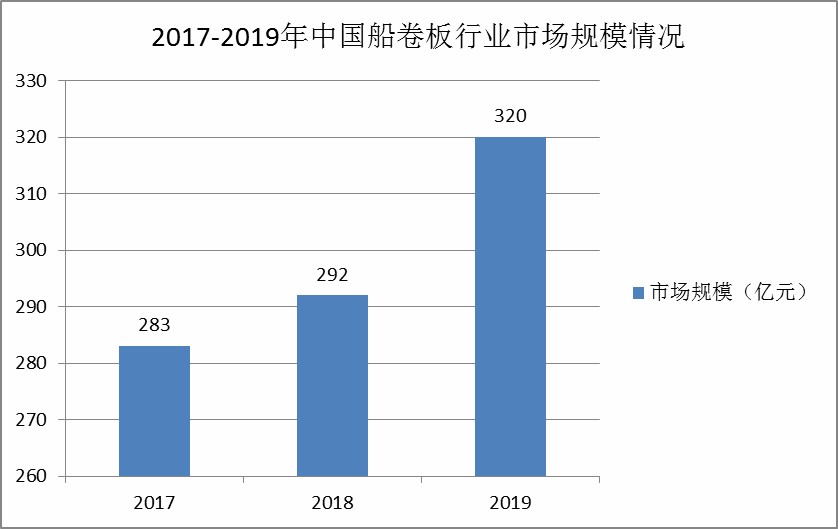 2019年,国内船卷板行业市场规模约为320亿元,较2018年上涨了9.59%,增长幅度较大,主要是船卷板的价格上涨明显,对船卷板市场的影响较大。