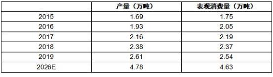 图表:2015-2026年中国飞秒激光加工的超疏水及亲疏水材料的产量、表观消费量情况及预测