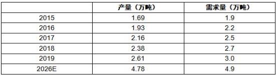 图表:2015-2026年中国飞秒激光加工的超疏水及亲疏水材料的产量、需求量情况及预测