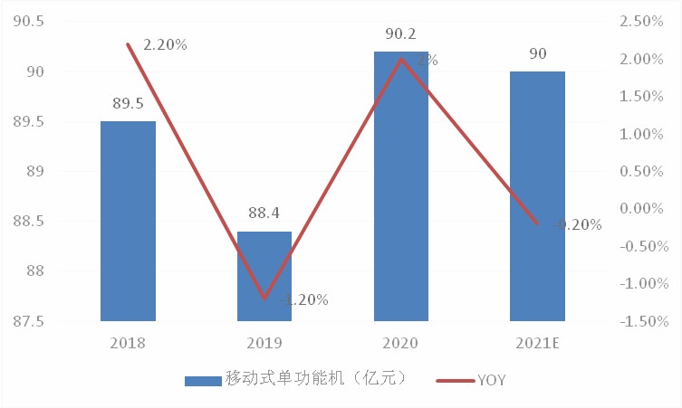图表:2018-2021年我国移动式单功能空调市场规模及增速情况