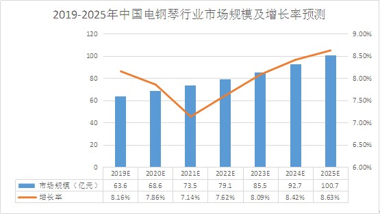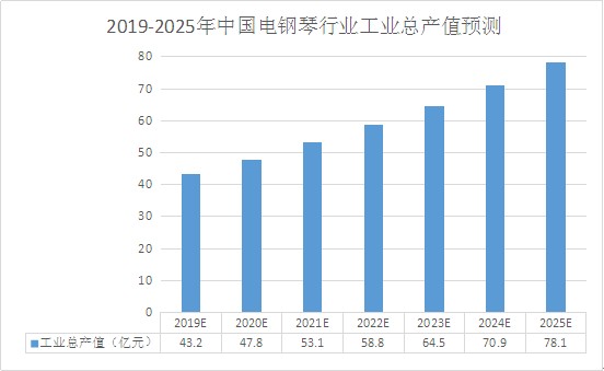 相关机构表示,2022年中国的电钢琴市场规模将达到79亿元,是2019年的1.2倍。有估算显示,2025年将增长至100亿元。