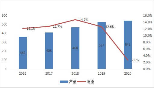 图表:2016-2020年中国玻璃纤维市场供给及增速情况(万吨)