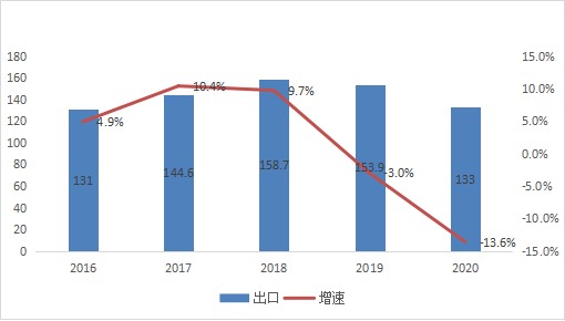 图表:2016-2020年我国玻璃纤维出口及增速情况分析(万吨)