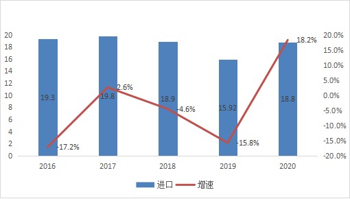 图表:2016-2020年我国玻璃纤维进口及增速情况分析(万吨)