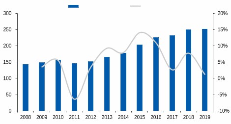 2008-2019年我国单采血浆站整体呈增长态势,2018年则达到257个。整体来说,我国血液制品行业的基础建设建设在逐步加强。