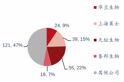 中国自2001年起不再批准新的血液制品制造商,自此发展十余年来形成了华兰生物、上海莱士、天坛生物和泰邦生物(美股上市)四个企业为龙头的新格局,中国现有约35家血液制品企业,2019年全国采浆量约9100吨,四家企业的采浆量合占全国采浆量的55%以上;浆站数量也占据全国浆站和的50%以上。