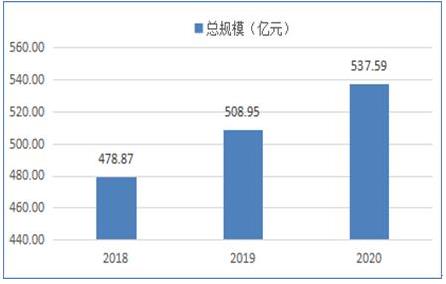 2018-2020年硫酸钙晶须行业市场总规模呈现稳定上升趋势,分别为478.87、508.95、537.59亿元。行业景气度的提高主要是上游产能、技术的提高及下游行业产品要求的上升激发的行业需求规模。