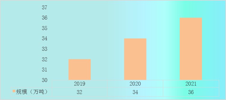 2019-2021年中国abs高胶粉市场需求由32万吨上升到36万吨。