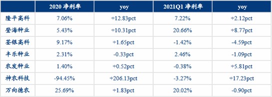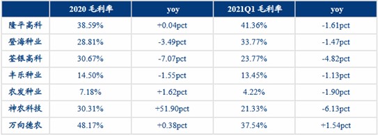 毛利率方面,2020年种业毛利率为22.76%,yoy+2.14pct,2021Q1种业毛利率为21.63%,yoy-6.30pct。分企业来看,2020年毛利率较高的种企为万向德农(48.17%)、隆平高科(38.59%),2021Q1多数种企毛利率同比下降,其中隆平高科毛利率领先(41.36%),同比略降1.61pct。