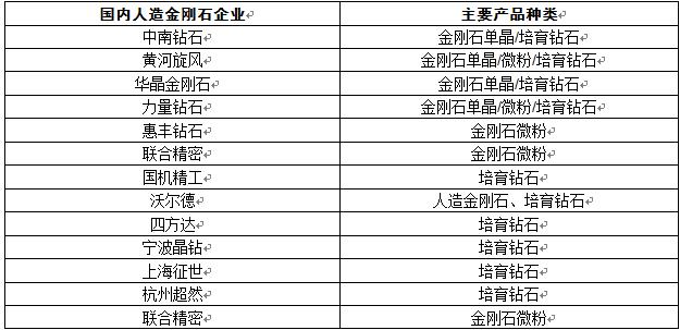 目前,国内的人造金刚石企业主要有:中南钻石、黄河旋风、华晶金刚石、力量钻石、惠丰钻石、联合精密等。其产品种类主要有:金刚石单晶、金刚石微粉、培育钻石等。