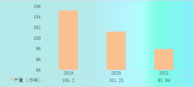 2019-2021年中国奶粉产量由105.2万吨下降到97.94万吨。