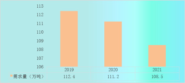 2019-2021年我国奶粉需求量由112.4万吨下降到108.5万吨。