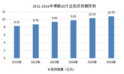 据数据显示,预测2021年裸眼3D行业投资规模为8.32亿元,2026年裸眼3D行业投资规模为10.78亿元,预测2021-2026年裸眼3D行业投资规模复合增长率为5.31%。