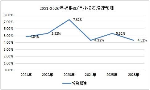 据数据显示,预测2021年裸眼3D行业投资增速为4.84%,2026年裸眼3D行业增速为4.32%,预测2021-2026年裸眼3D行业投资增速在5%左右。