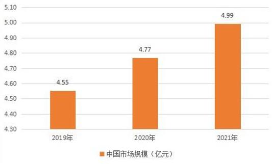 2019年中国花青素市场规模为4.55亿元,2020年花青素市场规模为4.77亿元,2021年市场规模达到4.99亿元。