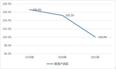 2019年中国清酒行业产销率为106.6%,2020年产销率为105.2%,2021年产销率为100%,产销逐渐平衡。