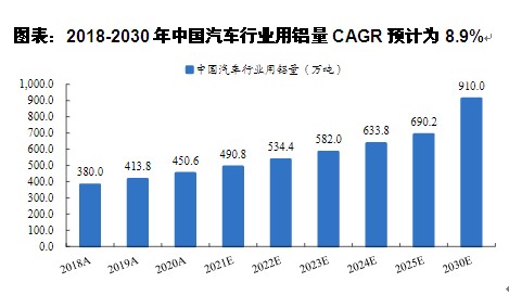 图表:2018-2030年中国汽车行业用铝量CAGR预计为8.9%