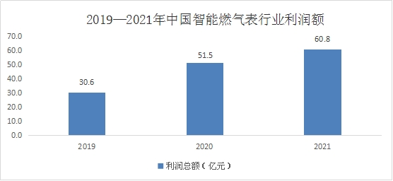 智能燃气表市场前景良好,行业利润总额逐年增多,其整体毛利率在30%-40%的区间,2021年行业净利润总额约为60亿元。