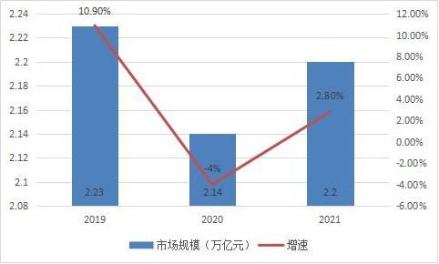 中国科技服务业市场规模达到了2.2万亿元,GDP占比在2.2%左右,市场规模较2020年期间同比增长大约2.2%。