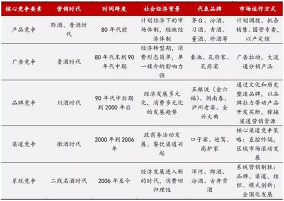 从七八十年代开始,白酒的营销开始步入一个创新轨道中,每一次创新都有一个先锋代表引领者行业的发展:从黔酒、汾酒依靠政府评比、计划批条不愁卖的时代到孔府家、秦池依靠广告拉动风靡大江南北;再到川酒改变依靠家门口的糖酒会招商模式开始做品牌,五粮液首创品牌拉动产品买断模式引领行业竞相模仿;徽酒依靠酒店和团购的"盘中盘"的渠道竞争模式取得行业领先,再到新竞争的时代,企业需要依靠品牌、产品结构、价格体系、组织设置、区域市场布局、资源及费用的投入模式等进行综合系统的竞争。