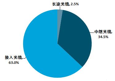 运营商光纤光缆部署分为长途光缆、中继光缆和接入光缆三类。截至2019年6月底,我国长途光缆线路、本地网中继光缆和接入网光缆、所占比重分别为2.5%、34.5%和63%。