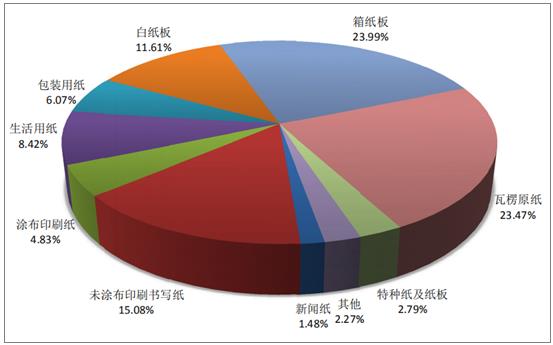 在纸及纸板的消费量中,需求最大的是箱纸板,占比23.99%,其次是瓦楞原纸,占比23.47%。