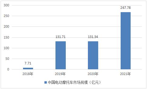 2018年中国电动摩托车市场规模为7.71亿元,2019年电动摩托车销量大增,市场规模达到131.71亿元,随着政策对电动摩托车的支持,2021年市场规模增长至267.78亿元。随着电池技术及中置式驱动电机的发展应用,电动摩托车以其适用性强、机动灵活、维修方便、价格低廉等优点,广泛应用于家庭、城乡、个体出租、厂区、矿区、环卫、社区保浩等短途运输领域,由于其具有倒车开关,可以灵活地穿行于狭小的马路问,这在道路狭窄的胡同、小巷非常实用。电动摩托车替代传统摩托车趋势增强,市场饱和度较低,发展空间大。