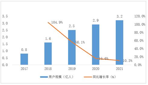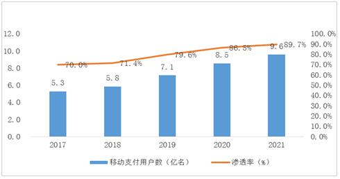 图表:2017-2021年中国移动支付用户数及渗透率