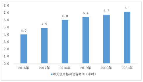 图表:2016-2021年中国用户每天使用移动设备时间