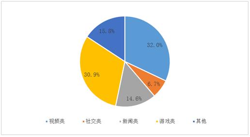 中国用户常用应用程序按应用类别划分为五类:视频类、社交类、其他、新闻类、游戏类应用程序。2020年中国用户每天在视频类应用程序花费的时间比例最大,为32.0%。其次为游戏类、其他、新闻类、社交类应用程序,占比分别为30.9%、15.8%、14.6%、6.7%。