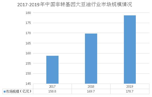 在国内非转基因大豆油市场中,由于进口大豆大多数属于转基因大豆,国内的非转基因大豆油的原材料主要来自国内的大豆种植,而国内的大豆对于进口的依赖程度较高,导致国内非转基因大豆油只占较小的比重。2019年,国内非转基因大豆油市场规模约为178.7亿元,较2018年上涨了5.3%。