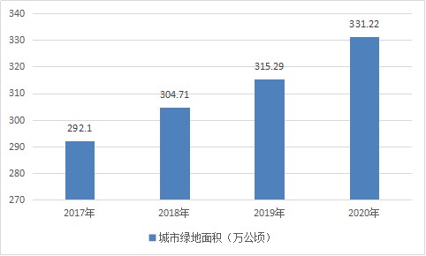 城市绿化是指在城市中植树造林、种草种花,把一定的地面空间覆盖或者是装点起来。城市绿化具有改善城市生态环境,维护城市生态平衡的重要作用。近年来,我国各城市地区不断增加当地的绿化面积,提高城市名誉。国家统计局数据显示,近几年,我国城市绿化面积逐年增加。2019年我国城市绿化总面积为315.3万公顷,同比2018年增长了3.5%。2020年绿地面积为331.22万公顷。