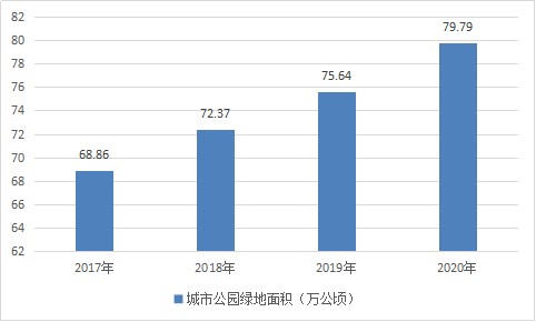 2017年城市公园绿地面积为68.86万公顷,至2020年城市公园绿地面积增长至79.79万公顷。
