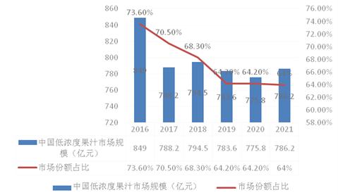 图表:2016-2021年中国低浓度果汁市场规模情况
