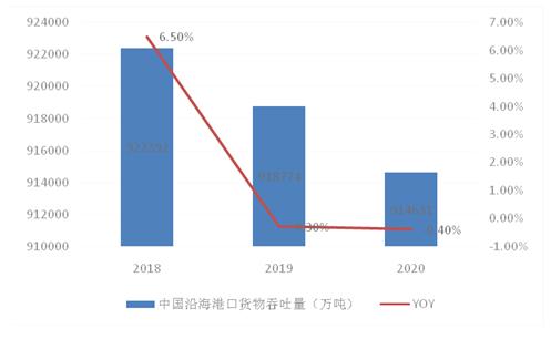港口货物吞吐量是港口物流能力的最基本的体现,沿海港口货物吞吐量需求不断增长的原动力来自于改革开放后充满活力的国民经济和国际贸易的快速发展,港口在国际航运市场上的竞争力逐步增强,在货物吞吐量和集装箱吞吐量方面领先世界,2020年我国沿海港口完成货物吞吐量91.4亿吨,其中货物出口量为41.8亿吨,货物进港量为49.6亿吨。