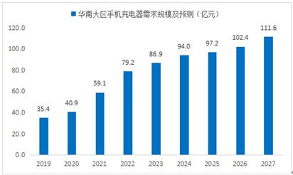 2019-2021年华南地区手机充电器行业需求规模保持增长趋势,2021年市场规模为59.1亿元,预计2022-2027年在消费水平增长推动下,2027年需求规模将达111.6亿元。