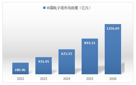 随着技术、需求多种因素综合推动,预计2022-2026年中国电子纸行业市场规模将呈现快速增长趋势,2026年市场规模将达1256.69亿元。主要依据来自以下几方面: