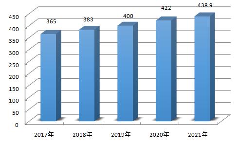 2017年中国铝箔产量为365万吨。从2017年至2021年,我国铝箔产量从365万吨提升至438.9万吨。由于新能源车的发展,车用铝和电池用铝的需求上升,铝箔行业的产量也逐步提升,未来产量可观。