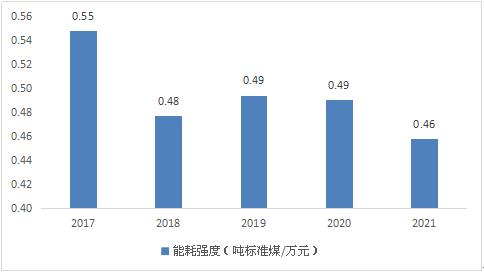 从能耗强度来看,我国的能耗强度是下降趋势,说明我国每万元的产值所需消耗的煤产量逐渐减少,从2017年的0.55吨标准煤减少到了2021年0.46吨标准煤。