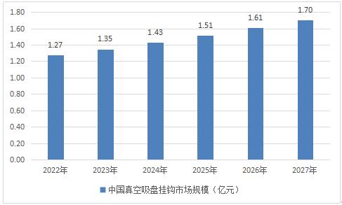 预测真空吸盘挂钩行业未来以6%的增速增长,预测2022年真空吸盘挂钩市场规模为1.27亿元,2027年市场规模为1.7亿元。