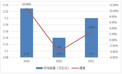 2021年中国科技服务业市场规模达到了2.2万亿元,GDP占比在2.2%左右,市场规模较2020年期间同比增长大约2.2%。