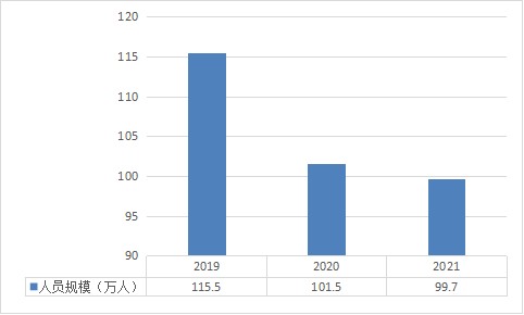 2019-2021年随着我国涂料行业整体市场集中度的提升,限额以下企业不断被清退,行业企业人员规模呈现出连续下降态势,2021年行业人员规模降至为99.78万人。